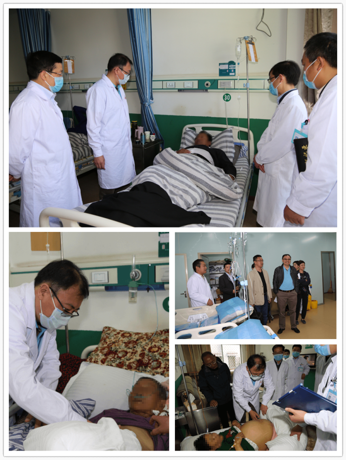 在阜康醫(yī)院住院部,周平紅教授一行換上工作服和阜康醫(yī)院消化內(nèi)科醫(yī)護(hù)人員一起查房。在44號(hào)尼珍的病床前,周平紅教授詳細(xì)詢(xún)問(wèn)病人的生理、病理指標(biāo),阜康醫(yī)院醫(yī)護(hù)人員一一詳細(xì)回答。之后,周平紅教授走到病床前對(duì)患者的體征狀況進(jìn)行了仔細(xì)檢查,并向家屬詢(xún)問(wèn)病人的實(shí)時(shí)病況。周平紅教授還來(lái)到89歲的患者扎西、離退休人員格桑的病床前,詢(xún)問(wèn)了病人的各項(xiàng)指標(biāo)并仔細(xì)進(jìn)行了體征檢查。